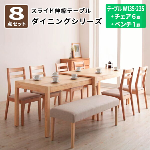 商品名最大235cm スライド伸縮テーブル ダイニングセット Torres トーレス 8点セット(テーブル+チェア6脚+ベンチ1脚) 幅135-235商品スペック■8点セット 【セット内容】テーブル、チェア×6、ベンチ×1 ■テーブル(W135-235) 【サイズ】幅135-235×奥行80×高さ72cm 【材質】天板:天然木アッシュ材 突板 仕上げ:ウレタン塗装 脚:天然木ラバーウッド材 【製品重量】43kg 【梱包数】1 【梱包サイズ/重量】135×90×22cm/46kg 【生産国】中国またはベトナム ※組立品 ■チェア 【サイズ】幅42×奥行50×高さ84(座面高44.5)cm 【材質】フレーム:天然木ラバーウッド材 張地:ポリエステル クッション材:ウレタンフォーム 【カラー】ブラウン/ベージュ 【製品重量】5kg(1脚) 【梱包数】1(2脚1梱包) 【梱包サイズ/重量】85×45×29cm/12kg 【生産国】マレーシア ※組立品 ■ベンチ 【サイズ】111×奥行40×高さ44.5cm 【材質】フレーム:天然木ラバーウッド材 張地:ポリエステル クッション材:ウェービングベルト、ウレタンフォーム 【カラー】ブラウン/ベージュ 【製品重量】6kg 【梱包数】1 【梱包サイズ/重量】111.5×41×13.5cm/7kg 【生産国】マレーシア ※組立品 ※サイズ、重量は概算です。